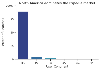 Our foray into the data begins with the engineered feature for user continent. From the graph, we can see that North American users offer a staggering 88% of the traffic to Expedia for hotels, and the other bars in the graph are tiny in comparison. If we analyze just the other 5 continents (sorry, Antarctica), then we see that Europe is the next most popular origin for Expedia users. Surprisingly, Oceania has the least number of searches, so maybe their market is taken up by other companies in the hotel realm of business.
