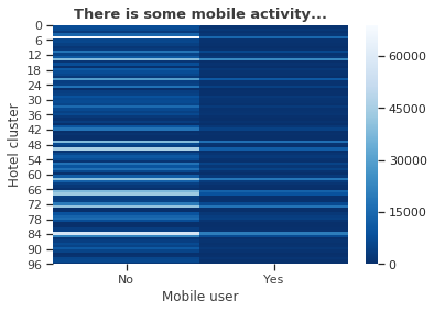 The next section of data that I was interested in exploring was the amount of mobile traffic that Expedia sees compared to PC users. We can see that each cluster of hotels has some sort of mobile activity, but by looking at the proportions for each cluster, mobile search is always outpaced by PC users in each cluster.